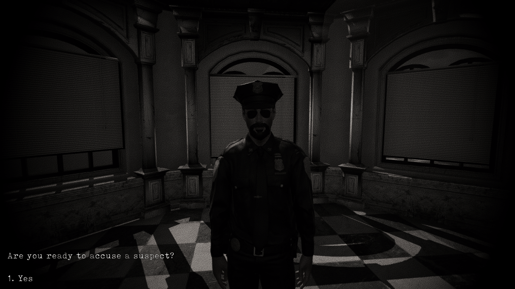 I will be continuing developing this project and adding more interactive elements to it. I want to play around with adding in a journal of sorts in the menu, so that the player can read the evidence they’ve already found in one place. I also want to add more audio such as talking and paper sound effects.