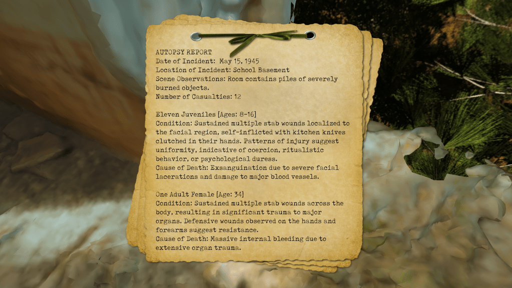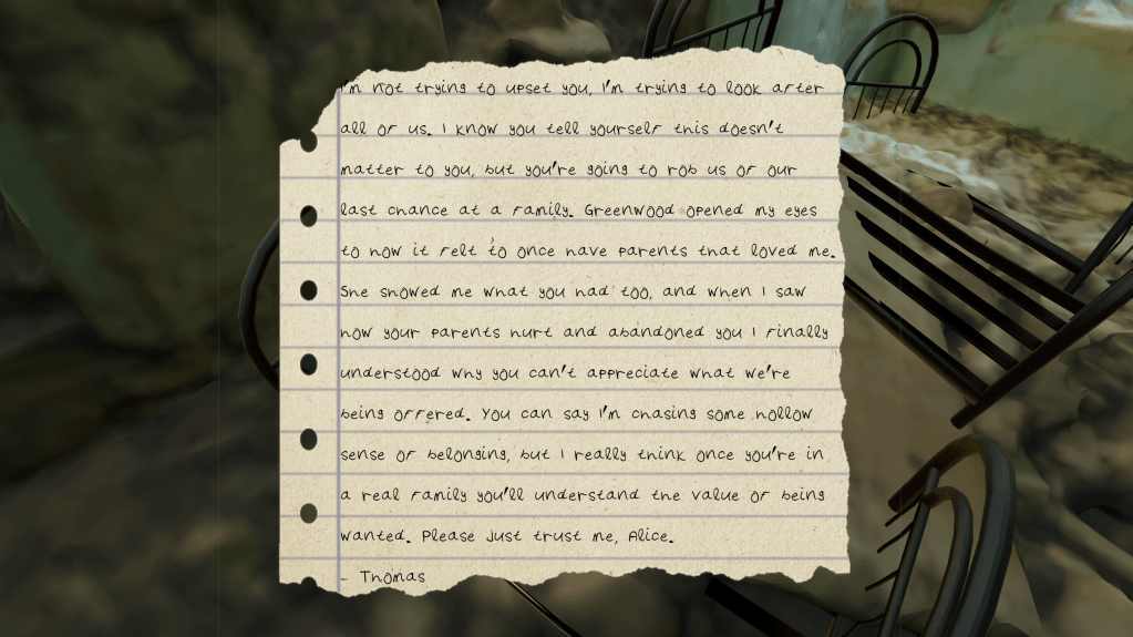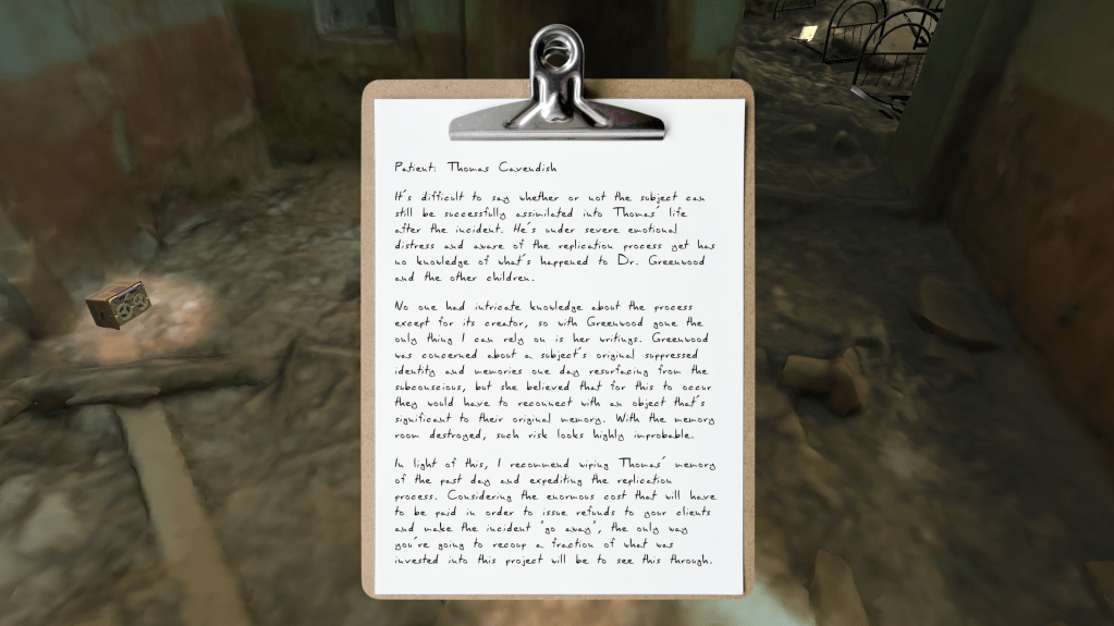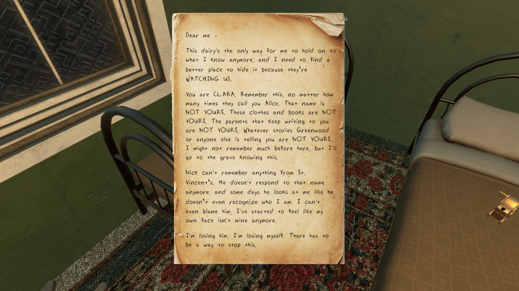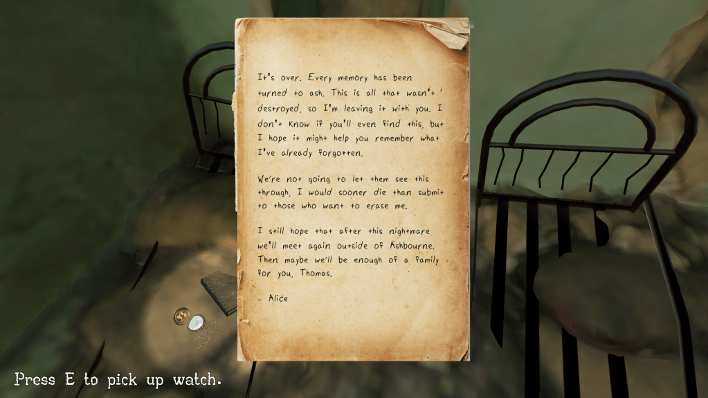 Unforgotten is a first person non-linear narrative game that follows the story of two young children as they slowly begin to realize their lives may not be what they seem. They uncover a sinister plot by their boarding school that involves stolen identities and cloning.
